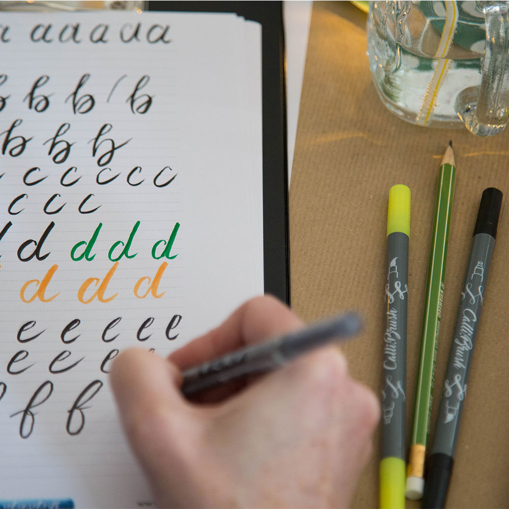 Bei diesem Motto ist der von Fee erstellte Lettering-Guide eine großartige Hilfe. Von einfachen Strichen, zum Alphabet bis hin zu den ersten Worten und Sätzen ist alles dabei. Schritt für Schritt gehen die Kursteilnehmerinnen den Lettering-Guide durch. Dabei haben sie die Möglichkeit, ihre eigenen Lettering-Stifte von der Goodie-Tüte zu benutzen oder andere Marken und Stifte auszuprobieren, die während des Workshops für alle bereitstehen.
