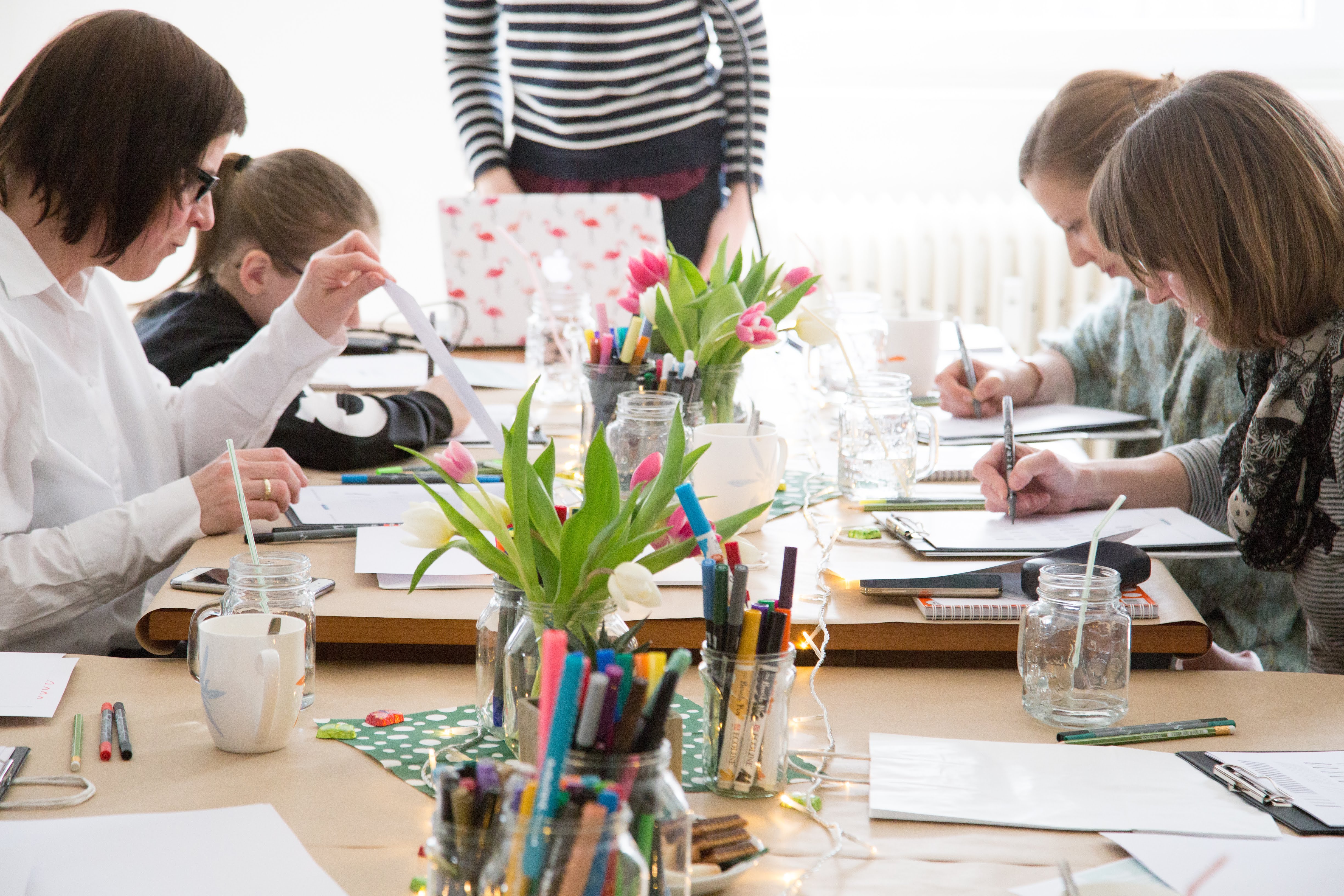 Gut gelaunt betreten die Teilnehmerinnen den Raum, der mit einem Meer aus bunten Letterings verglichen werden kann. Nach der Begrüßung begeben wir uns an den Tisch, der einer farbenfrohe Blumenwiese gleicht, auf der es Tombows, Eddings, Kuretake, CalliBrush, Ecoline, Tulpen und vieles mehr zu entdecken gibt. Für hungrige Bäuche und trockene Kehlen ist beim schoenschrift-Workshop auch gesorgt! Es gibt Limonade für die Süße, Kaffee oder Tee für die Wärme, Möhrchen für den Hasen oder Kekse für die Naschkatze – bist du die süße Naschkatze oder eher der warme Hase?